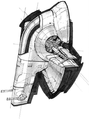 “The concussion missile's armored tube carries the warhead, a guidance computer, and a propellant system. Exterior shield projectors wrap the missile in a protective energy shroud, giving it the appearance of an elongated laser cannon.”